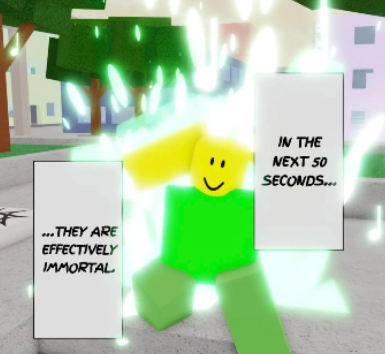 The fourth move is the embodiment of self perfection which is a domain expansion. When you use the domain there will be a purple bar next to everyone in the domain and when you get closer to them the bar starts going down and it goes faster the closer you get. When the bar goes all the way down their head will explode killing them instantly.